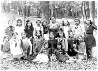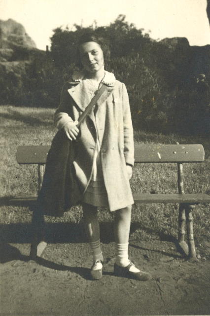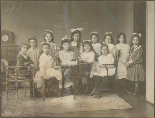 This photo, probably taken around 1933, shows Ruth Moses (middle row, second from left) and other students of Lilli Traumann’s class. Some of the girls, such as Edith Hirt (first row, first from left), Marion Heymann (first row, second from right) and Hilde Falck (back row, second from left), compiled an exercise book of couplets for Traumann while in first grade.