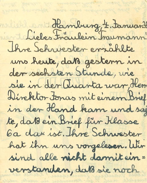After 1933, more and more children who had previously attended non-Jewish schools came to Jewish schools. The “First Ordinance to the Law against the Overcrowding of German Schools and Universities” [1. Verordnung zum Gesetz gegen die Überfüllung deutscher Schulen und Hochschulen] of April 25, 1933 limited the number of Jewish students allowed at secondary schools and universities to 5%, and to 1.5% for new admissions. The children who had to switch schools often came from families with little or no Jewish orientation and had had little connection with Judaism up to then. Initially the Jewish community shrank slowly, but after the 1938 November pogrom this process accelerated rapidly. Immediately afterwards, on November 15, 1938, Jews were banned outright from attending state schools. After the merger of the Talmud-Tora-Schule [Talmud-Torah School] and the Israelitische Töchterschule [Israelite Girls’ School] in 1938, there was only one Jewish school left in Hamburg where the remaining Jewish children were taught. Thus this school became the last community of Jewish families.