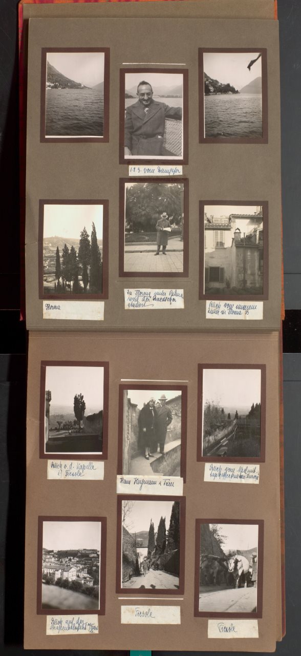 One of the two photo albums is dedicated to a trip to Italy. Travel albums were a very typical genre among (upper) middle-class families, whether Jewish or non-Jewish. As in the following example of the von der Porten family album, there also are recurring motifs in the case of the Neustadt family. On the one hand, the albums – apparently imitating motifs from contemporary magazines – contain many landscape photographs. The “man in front of car in front of landscape” motif is very common. On the other hand, these albums document visits to travel destinations typical for the educated German middle class of the time: for educational purposes, they visited medieval German cities such as Nuremberg, Rothenburg ob der Tauber or Heidelberg as well as Italian or Greek cities, often preselected by the most precise study of the Baedeker. The Alps are also popular as an object of study for the beauty of the landscape. These motifs can also be found in the Neustadt family album: on the left page one of the photos is labeled “Florence,” bearing the interesting caption “In Florence under palm trees the Baedeker is studied.”