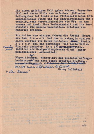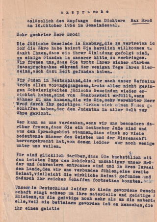 Max Brod is one of the German-speaking Jewish writers whose works are no longer known to many readers today. Having long been perceived mainly as Franz Kafka’s executor, who made great efforts to preserve Kafka’s work, Brod’s own texts have been receiving greater attention from literary scholars in recent years. As the typescript of Harry Goldstein’s “Address on the Occasion of the Reception of the Poet Max Brod in the Community Hall on October 16, 1954” with handwritten annotations makes clear, his visit to Hamburg a few years after the Shoah and after the reestablishment of the congregation was perceived as a great honor. Goldstein emphasized that the small Jewish community in Germany had become “destitute of people who could give it a spiritual foothold.” In Brod he saw a person who was capable of doing so; for Goldstein he was part of the “triumvirate whose brilliance illuminates our congregational life,” a triumvirate consisting of Leo Baeck, Martin Buber, and Max Brod. Both the famous Rabbi Leo Baeck and the religious philosopher Martin Buber had visited the Jewish congregation in previous years. The address testifies to the community’s difficulties in the postwar period, struggling not only for their material, but also for “spiritual existence.” Visits such as that of Max Brod represented an important acknowledgment of the congregation’s work.