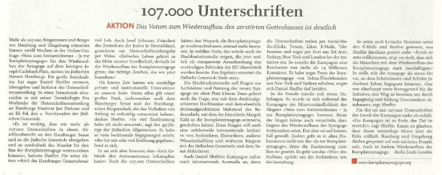 In November 2020, the German parliament decided to support the reconstruction of the synagogue, which had previously been approved by the Hamburg senate, with 65 million euros. Since then, the form of this new building has been debated in the city's public sphere, within and outside the Jewish community – a central part of the discussion is the question of whether the new synagogue should be built as a reconstruction on its historic site. While critics fear historical revisionism and point to the significance of the empty space and the memorial, proponents see a (re)construction on the same site as a sign of the present and future of Jewish life in Germany. According to its own information, the campaign “No to Antisemitism, Yes to the Bornplatz Synagogue” has found 107,000 supporters until today.