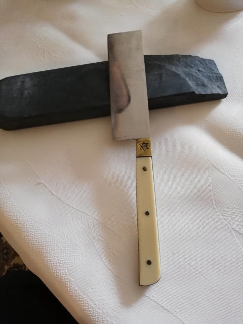 The shechita knife pictured here is in the private collection of one of the first Jewish Persians to immigrate, who had come to Hamburg from Iran in 1952, initially to trade in dried fruit and then in carpets. In the course of the 1950s, a growing group of Persian Jews immigrated to Hamburg, mostly unmarried young men who, together with non-Jewish Iranians, settled in the warehouses of the Speicherstadt district / free port to organize the carpet trade with Iran and neighboring regions from there. The success in trade led to the beginnings of a community. Persian-Jewish women came to Hamburg by way of marriage migration, and by the early 1970s there were already around 100 families living in the city, whose children, as the photo shows, also attended the Jewish congregation kindergarten. The shechet knife points to the everyday challenges Persian Jewish families faced in trying to obtain kosher meat in postwar Hamburg. Since the journey of a shochet was very costly and the centrally organized meat deliveries via the Jewish congregation did not yet exist in the early years, some of the immigrant families helped themselves by having the poultry slaughtered in their own bathrooms and making it kosher themselves. The consumption of kosher meat and Shabbat celebrations on Friday evenings, as well as feasts and holidays celebrated together, were among the shared rituals through which the Persian Jewish community cultivated its social cohesion. At the same time, the group regularly attended services at the Hohe Weide synagogue and made a significant contribution to maintaining religious community life. At times, members of the group were represented on the congregation board, while Persian-Jewish women in particular participated in social activities, such as the WIZO. (Text: Karen Körber)