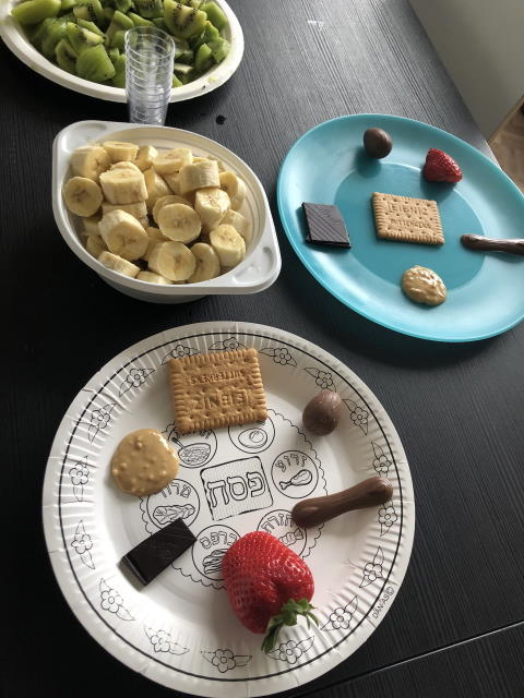 The photo shows the ingredients for a chocolate seder. The Seder evening is celebrated as part of the Passover festival, which commemorates the Israelites’ exodus from Egypt and liberation from slavery. On a traditional Seder plate are six mainly bitter ingredients, symbolic of the time of slavery. The traditional foods drawn on this paper plate, sroa (bone), karpas (vegetable), charosset (sweet paste), maror (bitter herb), chaseret (cabbage/salad) and a boiled egg, were replaced here with child-friendly ingredients such as cookies, strawberries or chocolate. This chocolate seder took place in 2019 as part of the congregation’s children’s and youth programs; such events serve to introduce younger generations to Jewish traditions through play.