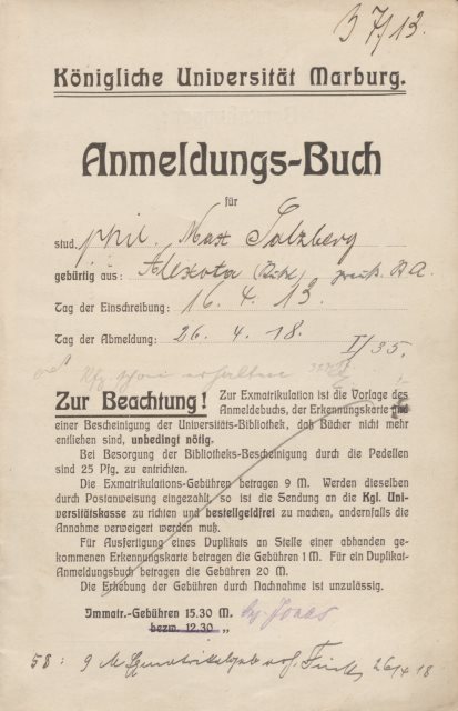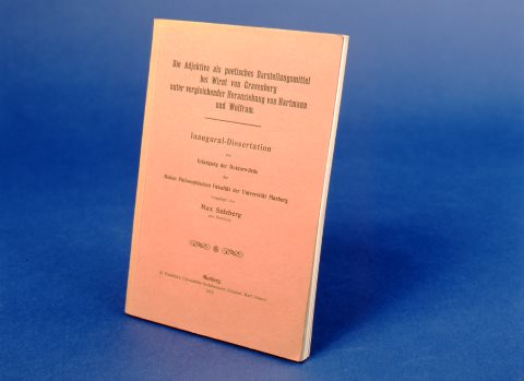 After re-enrolling at Marburg University, Max Salzberg received his doctorate on June 27, 1917, having written his PhD thesis on “Adjectives as a Poetic Means of Representation in Wirnt von Gravenberg with Comparative Reference to Hartmann and Wolfram.”