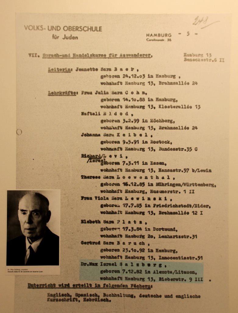 Many important personalities were taught by Salzberg in Hamburg before the Second World War, such as the Jewish historian Dr. Baruch Zwi Ophir, who studied in Hamburg, received his doctorate and emigrated to Palestine via Italy in 1933/35.