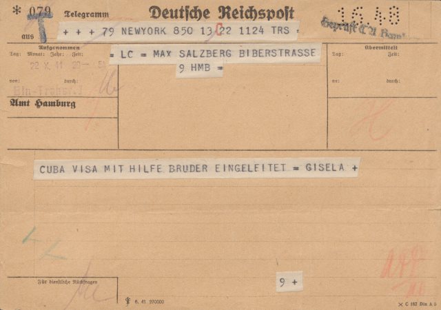 As correspondence and telegrams show, Gisela Warburg and one of Max Salzberg’s brothers also used personal contacts in order to enable the Salzbergs to emigrate. When the crossing to the USA turned out to be difficult, both tried to obtain a visa for Cuba for the couple. However, their efforts were unsuccessful: Shortly before the Salzbergs were able to leave Germany, an emigration ban for Jews was issued on October 23, 1941. Max Salzberg’s poor state of health due to the accident also prevented further escape plans.