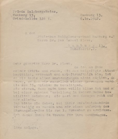 The status of “non-privileged mixed marriage” meant that the Salzbergs had to move to a “Jewish house,” their assets were frozen and Frida lost her job. Frida repeatedly tried to defend herself against the racist regulations of the Nazi regime and partly succeeded. Max Salzberg was protected by the marriage, since Jewish spouses of a “non-privileged mixed marriage” were excluded from deportations until the beginning of 1945. Although they did not manage to emigrate to the USA or Cuba, Frida and Max managed to survive in Hamburg until the end of the war despite the continuously aggravating circumstances.