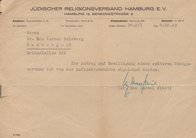 However, his teaching work in the immediate postwar period was particularly frustrating for Max Salzberg: “I cannot report anything positive about my work. I no longer have a single student. I give two more courses in the congregation, one and a half hours a week, but they don’t satisfy me. They are children who have no interest in Hebrew, and if one or the other still wants to learn Hebrew, it meets with rejection on the part of the parents or otherwise.” (Letter from Max Salzberg to unknown recipient, Hamburg, [October 13, 1946]; Foundation Historical Museums Hamburg, Altona Museum, 1993-2172, 16.)