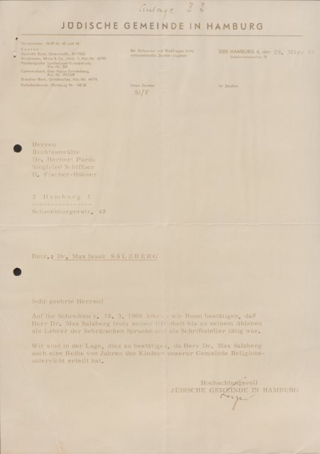 “He [Max Salzberg] is known and highly esteemed in the broadest circles of the Hamburg community as an important expert on Hebrew literature from the biblical and Talmudic period to the present day. Young people and older men and women visit him and are enthusiastic about his teaching. [...] I myself have been coming to Dr. Salzberg for a long time for the purpose of further training in New Hebrew and always admire his extensive knowledge.” (Letter from rabbi Dr. Joseph Norden of August 14, 1939, State Archive Hamburg, 622-1/214 Salzberg, No. 38.)
