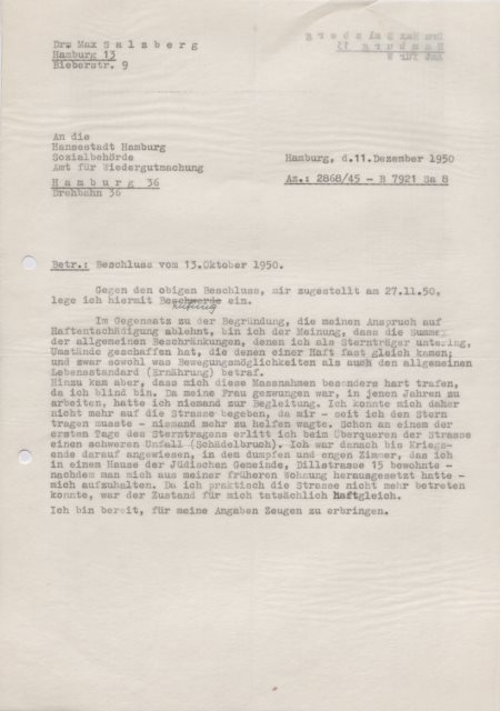 Salzberg appealed this decision on December 11, 1950, referring to the special circumstances resulting from his blindness: “Since my wife was forced to work in those years, I had no one to accompany me. I could therefore no longer go out in the street since nobody dared to help me since I had to wear the star. On one of the first days of wearing the star I suffered a serious accident (skull fracture) while crossing the road. After that I had to stay in the dull and narrow room I lived in in a house of the Jewish community, Dillstrasse 15 until the end of the war [...]. Since I could practically no longer go out in the street, my situation was indeed the same as imprisonment.” (Letter from Max Salzberg to the Hanseatic City of Hamburg, Social Welfare Office, Office for Compensation and Restitution dated December 11, 1950, State Archive Hamburg, 622-1/214 Salzberg, No. 42 (3)) The appeal was successful, but Max Salzberg was not granted compensation until about a year later, in October 1951.