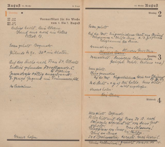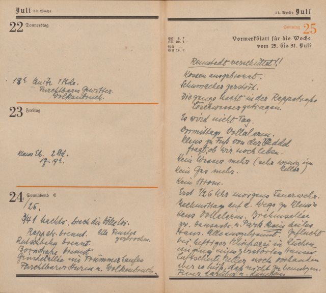 Frida Salzberg wrote dates and experiences in her calendar almost daily, even during the war years. These are a rich source for the history of everyday life during National Socialisn. In addition to incisive events such as forced relocations or summonses to the Gestapo, Frida also wrote down everyday occurrences such as shopping, lessons and letters received. Her descriptions of “Operation Gomorrha,” in which a series of British and U.S. air raids from July 24 to August 3, 1943 destroyed large parts of Hamburg, are very evocative. On July 24/25 Frida wrote: “At 12:45 at night all hell broke loose: Rappstraße is on fire. All windows broken. Rutschbahn is on fire. Bornstraße on fire. Grindelallee a heap of rubble. [...] Carried water to put out the fires on Rappstraße all night long. Daylight won’t come. Full alarm in the morning [...] No more water (very little in the cellar). No more gas. No electricity. Fire brigade arriving only at 5:30 am.” (Notebook 1943 by Frida Salzberg, State Archive Hamburg, 622-1/214 Salzberg, No. 9.2 (2).)