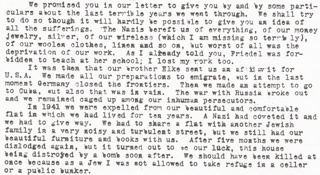 “The Nazis bereft us of everything, of our money, jewelry, silver, of our wireless (which I am missing so terribly), of our woolen clothes, linen and so on, but worst of all was the deprivation of our work. […] We made all our preparations to emigrate, but in the last moment Germany closed the frontiers. Then we made an attempt to go to Cuba, but also that was in vain. The war with Russia broke out and we remained caged up among our inhuman persecutors.“