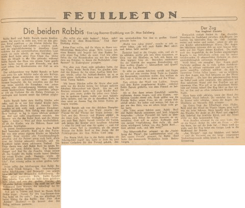 In his short stories about important Jewish festivals published from 1947 on in the Jüdisches Gemeindeblatt für die britische Zonen (Jewish Community Gazette for the British Zone), Salzberg built on these childhood experiences. From the beginning of the 1950s, corresponding articles were also an integral part of the Allgemeine Wochenzeitung der Juden in Deutschland. It was founded in 1946 as the Jüdisches Gemeindeblatt für die Nord-Rheinprovinz und Westfalen (Jewish Community Gazette for the North Rhine Province and Westphalia). The first editor-in-chief and founding editor was the journalist Karl Marx, who returned to Germany in 1946 as one of the first Jewish emigrants. With the Gemeindeblatt as a licensed newspaper, he was instrumental in the rebuilding of Jewish community structures, including the Central Council of Jews in Germany. In 1948, the newspaper was initially renamed Allgemeine Wochenzeitung, which since 1955 has been published as the Allgemeine jüdische Wochenzeitung or Jüdische Allgemeine and is still the most important and highest-circulation German-Jewish newspaper.