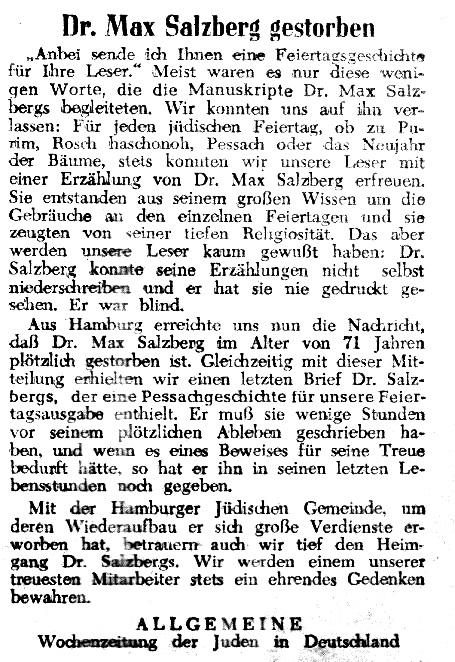A few days after Max Salzberg’s death, the Allgemeine Wochenzeitung der Juden in Deutschland published an obituary on him. The obituary shows Salzberg’s great importance for the newspaper. As one of its “most loyal employees,” he reliably wrote a contribution for every Jewish holiday. These testified to his great knowledge and deep religiousness, as the obituary says. He had written his last story for the AWZdJ only a few hours before his death. In addition, the obituary emphasizes his significant contribution to the reconstruction of the Hamburg Jewish congregation, which most likely refers to his work as a teacher.