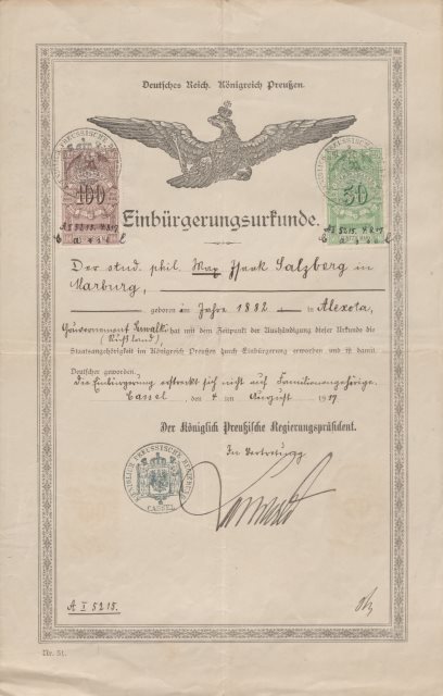 Before and during the First World War, Max Salzberg tried to obtain Prussian citizenship. In a petition to Kaiser Wilhelm II, he also describes his origins, childhood and youth: