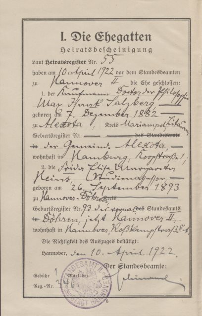 Around 1916 she first met Max Salzberg in a lecture and then supported him during his studies by reading him texts. In 1922 the two married and moved into an apartment in Hamburg-Wandsbek.