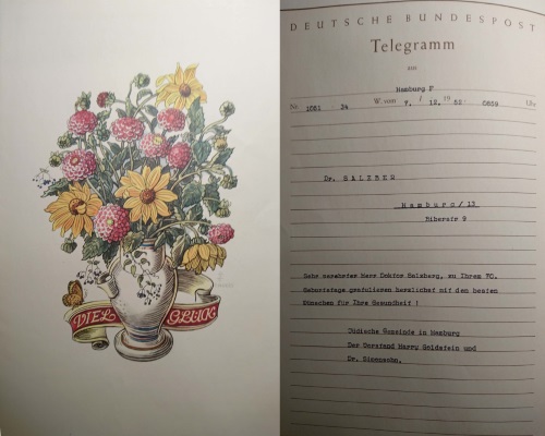 Not only was the everyday life of the Salzberg couple in the postwar period marked by the protracted compensation procedure. The loss of a large part of their circle of friends and acquaintances through emigration, murder or suicide due to persecution hit Max Salzberg particularly hard. Due to his disability, social contacts were important to him, as he was dependent on help for reading aloud or going for a walk. All the more important for him was the Jewish congregation in Hamburg, not least because of the importance Jewish religion and culture had in his life. With his work as a teacher of religion and Hebrew, which he resumed in the postwar period, he made an important contribution to the reconstruction of the congregation.