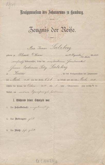 “I was born at Alexota near Kowno in Russia in 1882 as the son of a tailor. My parents’ great poverty did not allow them to educate me as a Talmud scholar according to their ideals. However, my love for my parents showed me the way to fulfill their wish anyway. At the age of thirteen I therefore went to a small town a few miles away from my homeland and studied there at a Talmud school under great hardships; often I had to earn the bare necessities by hard physical labor. [...] My father’s increasing poverty due to unemployment forced him to allow me to interrupt the Talmud studies for some time. I took the position of Talmud teacher in a village. In addition to the long working hours required by my twelve students of different ages, I also gave private lessons that would later allow me to travel to the foreign country I had longed for.”(Draft of a letter from Max Salzberg to Kaiser Wilhelm II for the purpose of requesting naturalization, undated, probably 1914/1915; State Archive Hamburg, 622-1/214 Salzberg, No. 1.)